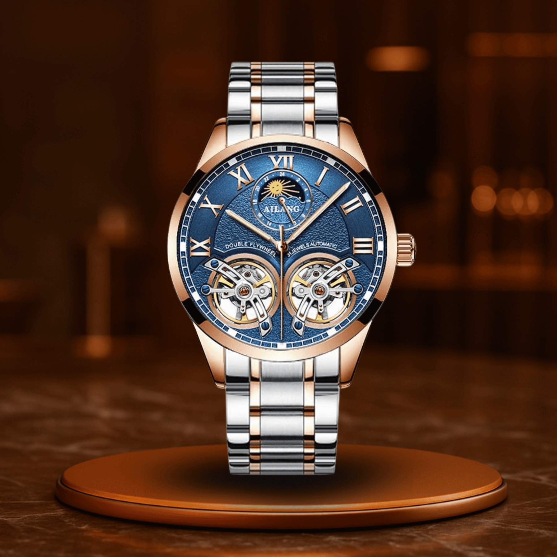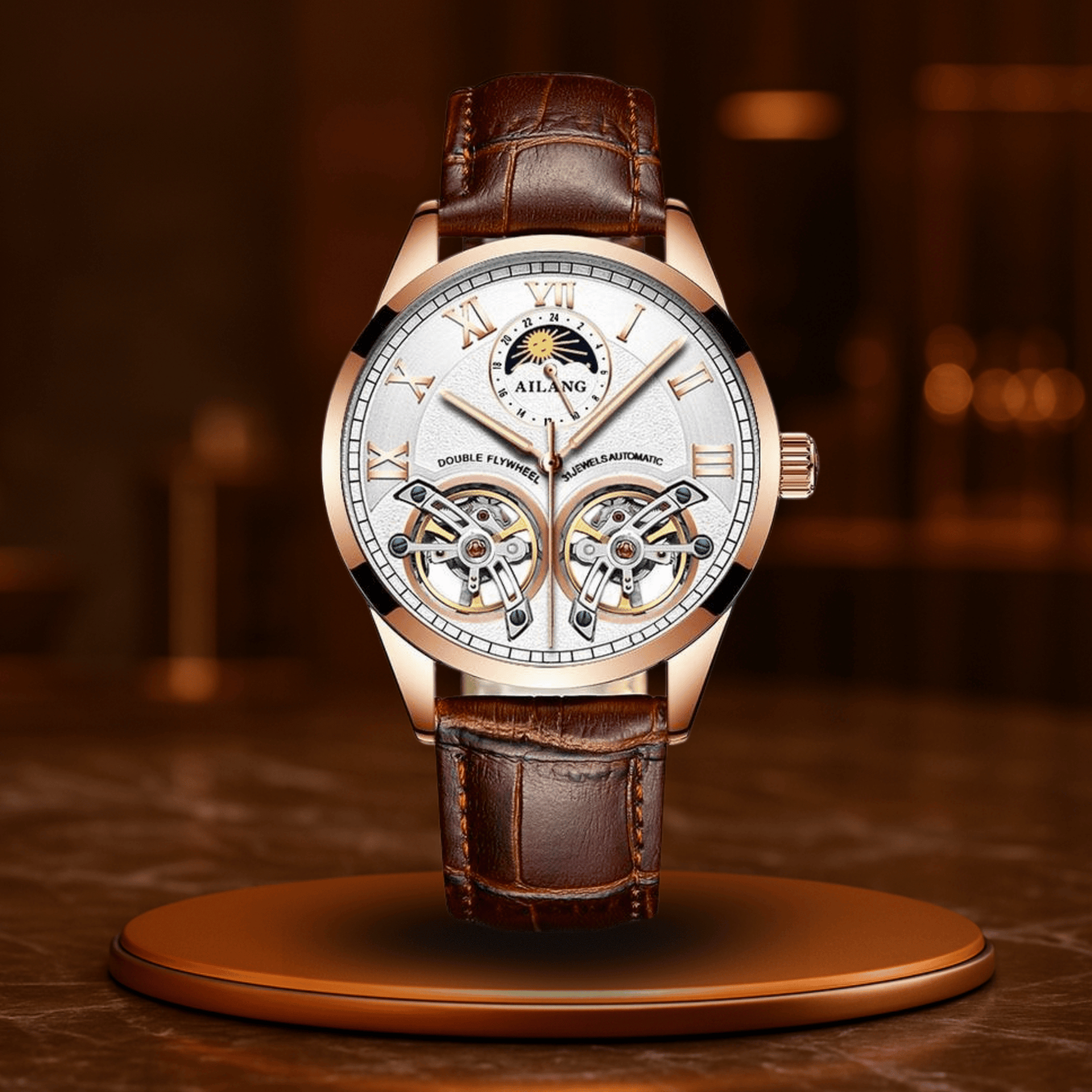 Il lussuoso bracciale in pelle si adatta morbidamente al polso, mentre la cassa da 41 mm bilancia perfettamente eleganza e presenza. L'indicatore delle fasi lunari? Un'inclinazione sottile verso il cielo – per uomini che pensano in grande, oltre gli appuntamenti.